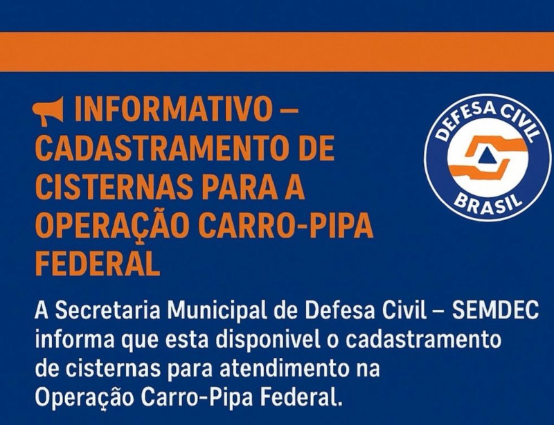 A Prefeitura Municipal de Conceição, por meio da Secretaria Municipal de Defesa Civil (SEMDEC), anunciou que a partir da próxima terça-feira (19) estará aberto o cadastramento de cisternas para atendimento dentro da Operação Carro-Pipa Federal.