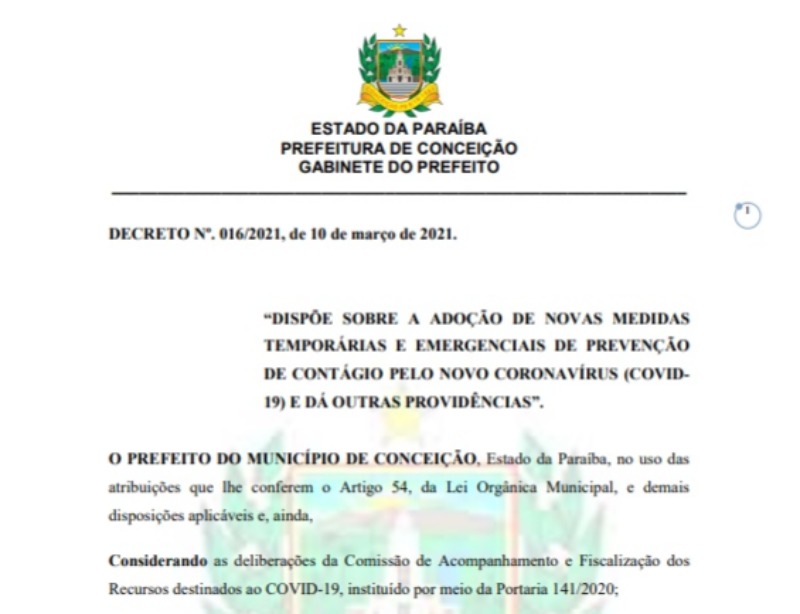 O Município de Conceição publicou nesta quarta-feira (10) o Decreto nº 016/2021 que dispõe sobre a adoção de novas medidas complementares e emergenciais para prevenção ao contágio da Covid-19. O documento foi elaborado com base na classificação epidemiológica estabelecida pelo Governo do Estado, considerando que o Município se enquadra atualmente na condição de bandeira laranja.