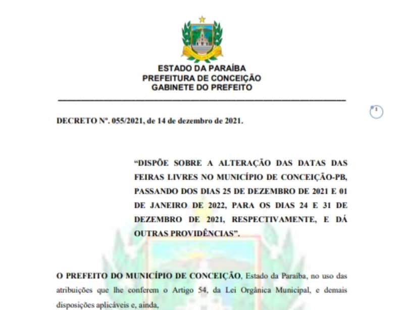 A Prefeitura de Conceição publicou nessa terça-feira (14) o Decreto nº 055/2021 que dispõe sobre a alteração de datas para realização da Feira Livre no Município.