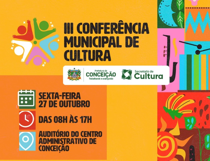 A Prefeitura de Conceição vai promover nesta, próxima sexta-feira (27), a III Conferência Municipal de Cultura. O evento está programado para acontecer das 8h às 17h, no auditório do Centro Administrativo da cidade.