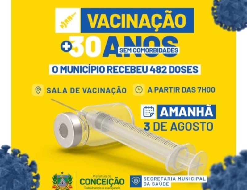 A partir desta terça-feira (3) a Prefeitura de Conceição, através da Secretaria de Saúde, vai seguir realizando a imunização contra Covid-19 no público-alvo formado por pessoas com 30 anos ou mais.
