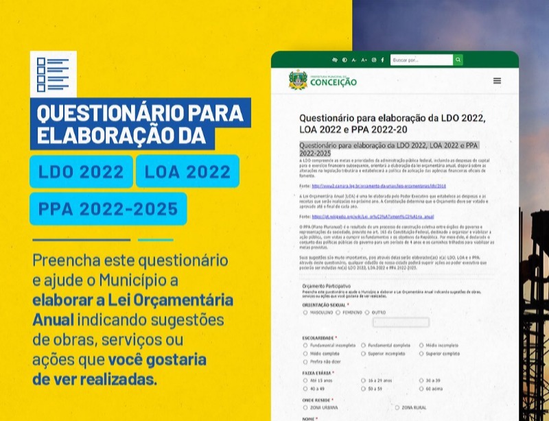 O Município de Conceição disponibilizou neste mês de abril, um questionário digital para garantir a participação da população durante o desenvolvimento do processo de elaboração da Lei de Diretrizes Orçamentárias (LDO).