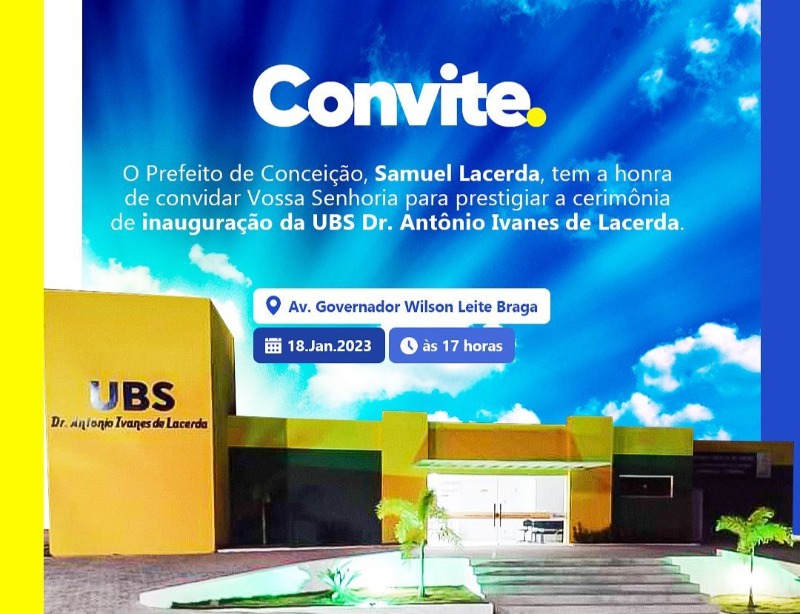 A Prefeitura de Conceição vai inaugurar na quarta-feira (18) a Unidade Básica de Saúde (UBS) Dr. Ivânes de Lacerda. O anúncio foi feito pelo prefeito do município, Samuel Lacerda, através de uma publicação em uma página na internet.