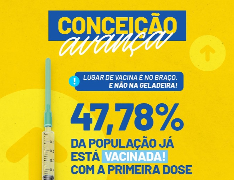 A Secretaria de Saúde de Conceição já imunizou 47,78% da população contra a Covid-19, considerando a aplicação da primeira dose dos imunizantes disponibilizados pelo Ministério da Saúde.